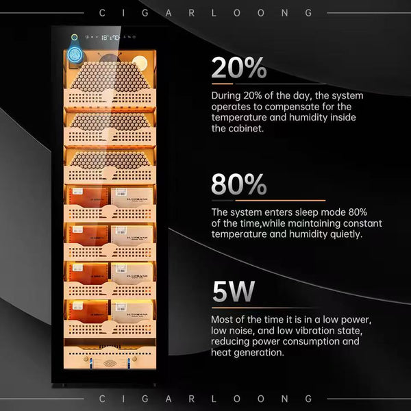 [Design] 360-degree air cooling, no frost, intelligent constant temperature and humidity environment, energy-saving dual-core dual-core heat dissipation, negative ions purify the internal air, Spanish cedar wood shelf emits natural aroma to prevent cigars from breeding insects. It is a natural companion for cigars. The upper part of the item is suitable for loose cigars. Boxed cigars can be placed in the lower part.